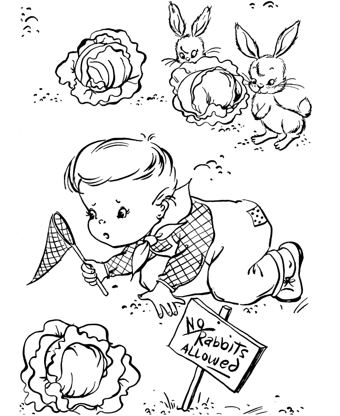 This Easter Kids Fun coloring page shows a boy looking for rabbits in the lettuce patch.