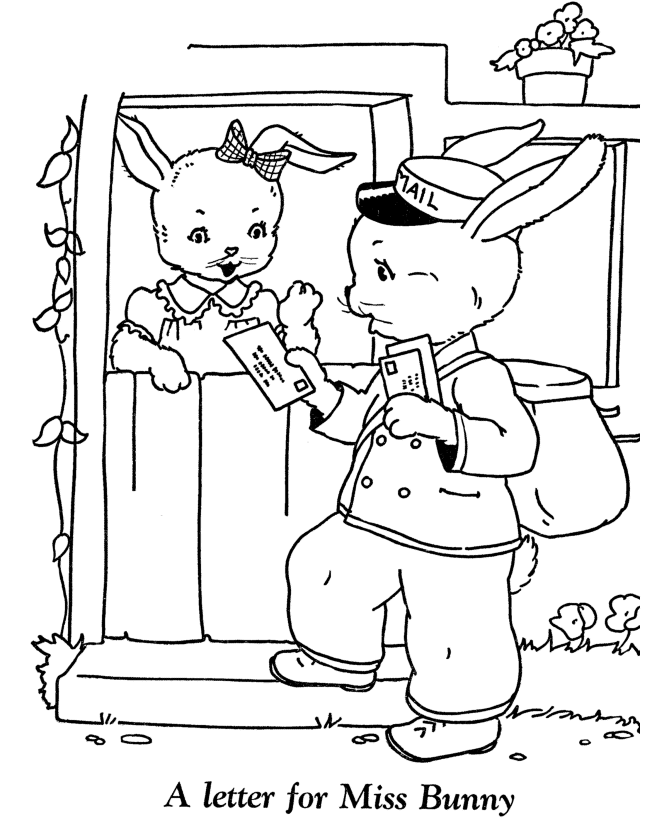 This Easter Kids Fun coloring page shows a bunny mailman, delivering a easter card to a girl bunny.